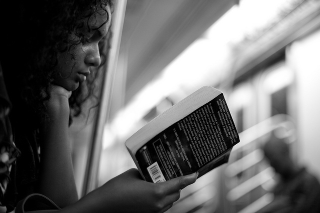 A woman reads a book as she rides the subway in New York City on July 18, 2010.